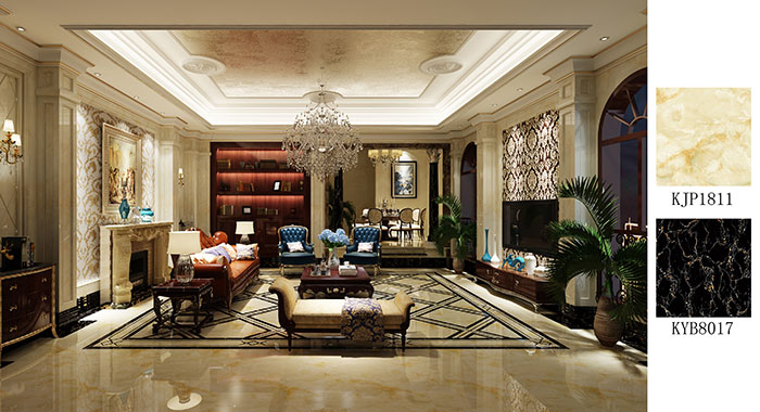 生活美學是自然而然的流露,客廳的每一處都透著浪漫與時尚。地麵主要鋪貼金剛釉瓷磚香檳玉KJP1811,搭配大理石瓷磚黑金花KYB8017,唯美典雅,讓家成為人們心中最溫馨的港灣。