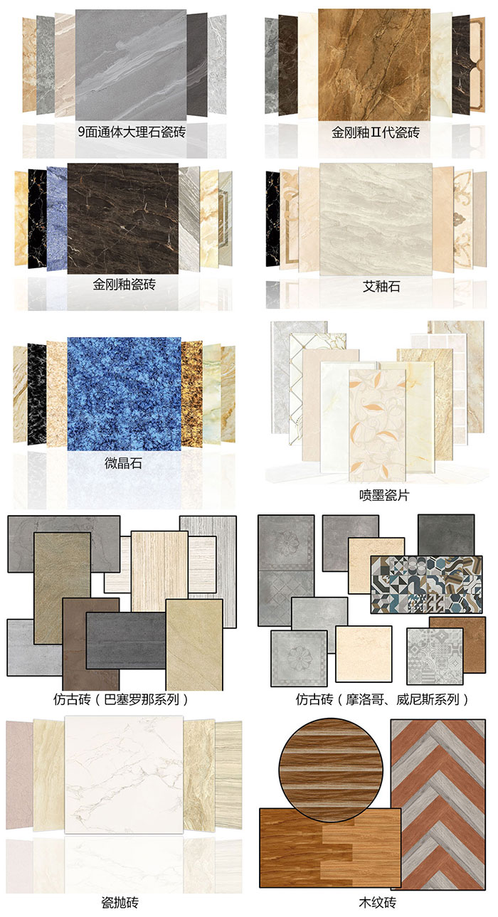 目前擁有緞光釉、瓷拋磚、9麵通體大理石瓷磚、金剛釉Ⅱ代瓷磚、仿古磚、木紋磚、艾釉石、2.0厚微晶石、內牆磚(瓷片)、拋光磚等多個品類200多款產品花色。
