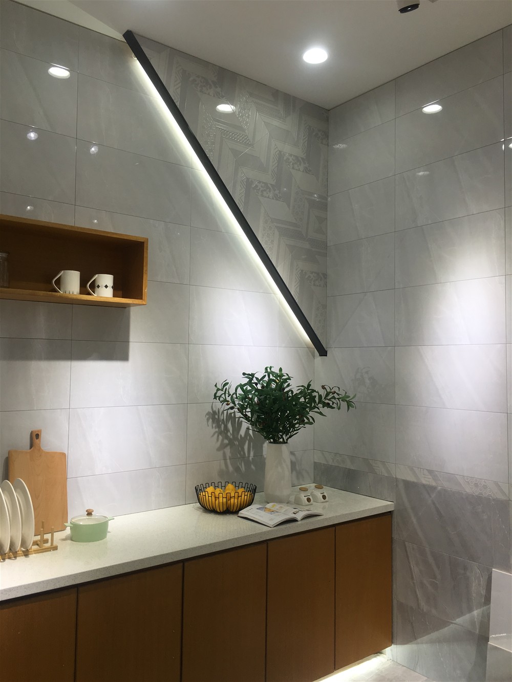 廚房:不飽和的灰色調搭配不傳統的燈光裝飾,台上有綠色植物的點綴,主人又怎麽會不愛好烹飪呢?