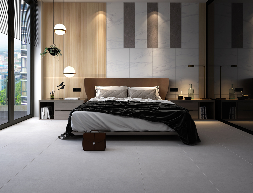 (15°緞光釉KFD8808)主臥室依然延續冷淡的灰色基調,以簡潔舒適為主,營造出安靜舒心的睡眠環境。