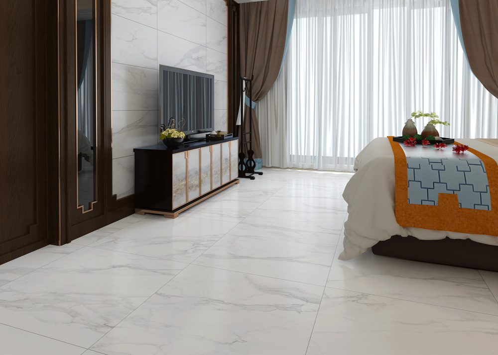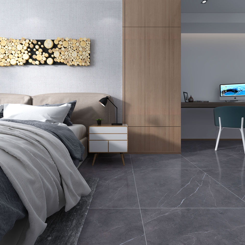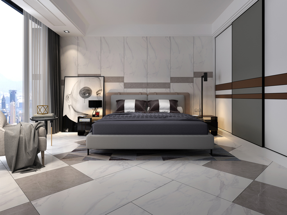 (15°緞光釉KFD126A01)錯位鋪貼的鋪磚方式,凸顯空間層次感,床尾配有布藝沙發,在窗邊看著這城市的日落和日出,一天都不會覺得枯燥。