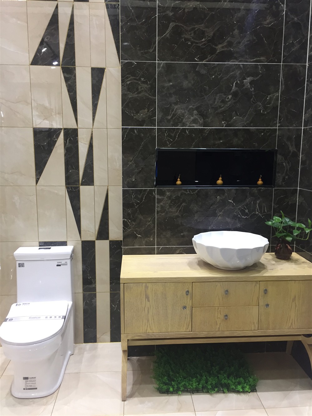 衛生間模擬間:由通體大理石金王啡KTB8018與冰帕玉KTA8305搭配鋪設,一深一淺搭配出空間層次感,三角形與矩形相互交錯,讓空間個性不單調。