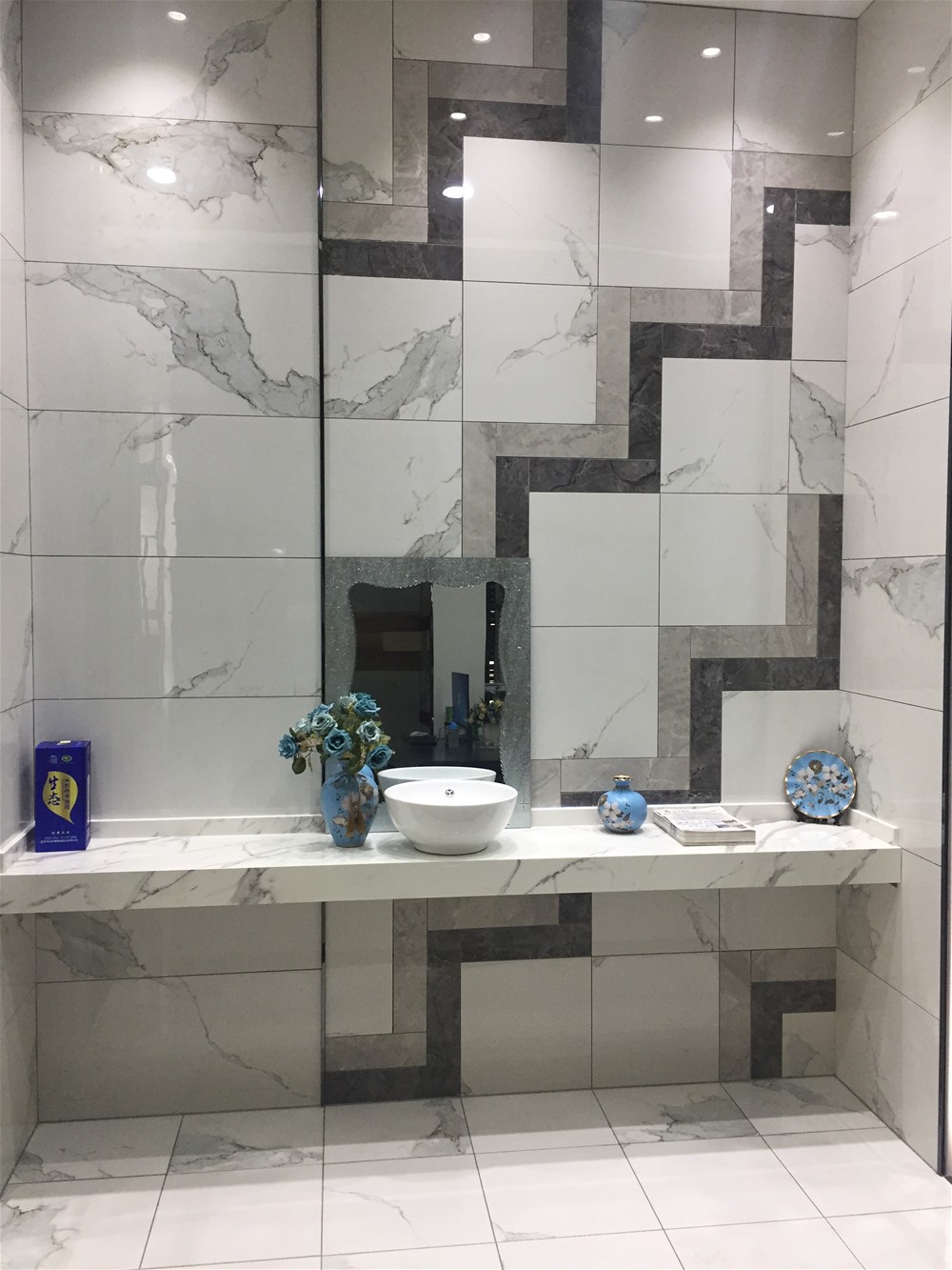 衛生間模擬間:卡拉卡石是近兩年最暢銷的產品,大氣、逼真的灰色調紋理變幻無窮,淺灰與深灰色瓷磚階梯式鋪貼,突破常規。高端大理石洗手台與空間呈現和諧統一,營造輕奢個性化空間。.